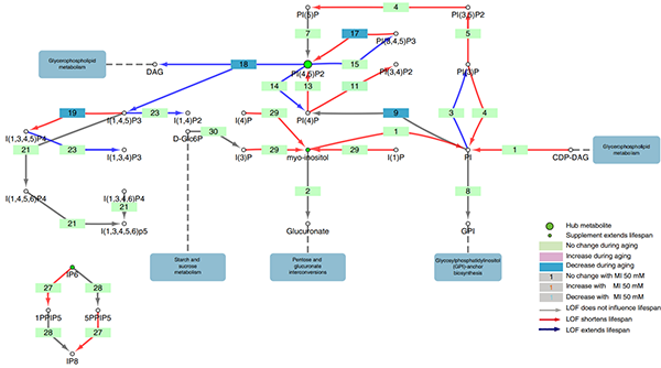 圖1:線蟲myo-inositol的代謝通路圖。每個圓圈表示一個代謝物。每個方格指代一個酶,用數(shù)字代替。列出的代謝物和酶均是線蟲中存在的。絳紅色方格表示該步反應(yīng)的酶在衰老過程中mRNA水平上升,藍(lán)色方格反之。紅色箭頭指示減少該代謝物縮短線蟲壽命,藍(lán)色箭頭反之(本圖只標(biāo)注p < 0.05的數(shù)據(jù))。