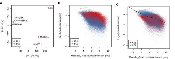 圖二:(A)對來自不同的人的H3K27ac ChIP-seq樣本進行主成分分析。這里LCL(lymphoblastoid cell line)組包含三個源于正常人的B細胞的細胞系;CLL(chronic lymphocytic leukemia)組包含三個源于慢性淋巴細胞白血病患者的B細胞的細胞系。(B)關(guān)于來自不同組的均值和未修正的方差的散點圖。(C)關(guān)于均值和修正后的方差的散點圖,以及由此進行下一步統(tǒng)計建模。