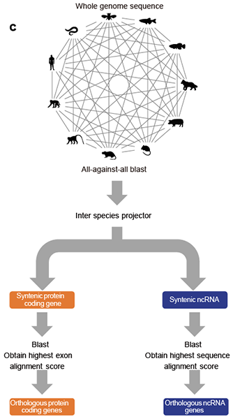 圖1. 11個(gè)物種間兩兩比對(duì)識(shí)別同源基因流程圖