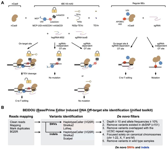 圖示:(A) tBE作用的原理示意圖。以tBE-V5–mA3為例,其可在靶位點去除dCDI產(chǎn)生高效編輯效果,但在OTss和OTsg位點時由于dCDI的存在可以抑制非靶向突變。(B) BEIDOU計算分析流程評估堿基編輯的潛在全基因組水平脫靶。