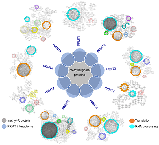研究顯示,人類PRMT互作組與已知的含甲基精氨酸的蛋白質(zhì)高度重疊,且不同PRMT之間有補(bǔ)償效應(yīng),主要表現(xiàn)為它們底物之間顯著重疊,并且底物甲基化基序也具有高度相似性。研究發(fā)現(xiàn)PRMT的催化底物主要是參與了mRNA剪接和翻譯的RNA結(jié)合蛋白(RBP),并且這些RBP含有高度富集的精氨酸甲基化區(qū)域。此外,該研究證實(shí)抑制PRMT活性可以廣泛地改變可變剪接并抑制翻譯。值得一提的是,研究發(fā)現(xiàn)核糖體蛋白含有大量的精氨酸甲基化修飾,其甲基化位點(diǎn)的突變抑制了核糖體組裝、mRNA翻譯以及細(xì)胞生長。
