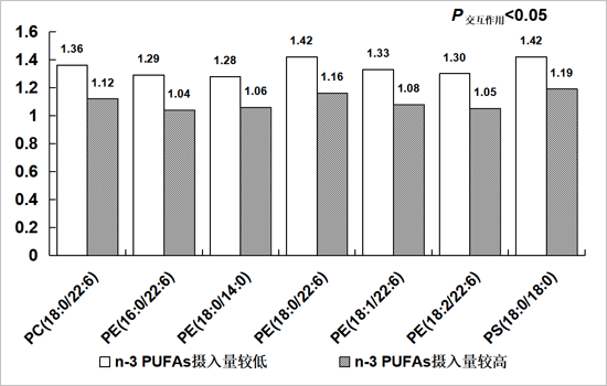 圖5. 根據(jù)紅細(xì)胞膜n-3 多不飽和脂肪酸(PUFAs)水平對(duì)血漿甘油磷脂與新發(fā)代謝綜合征間關(guān)聯(lián)關(guān)系進(jìn)行分層分析