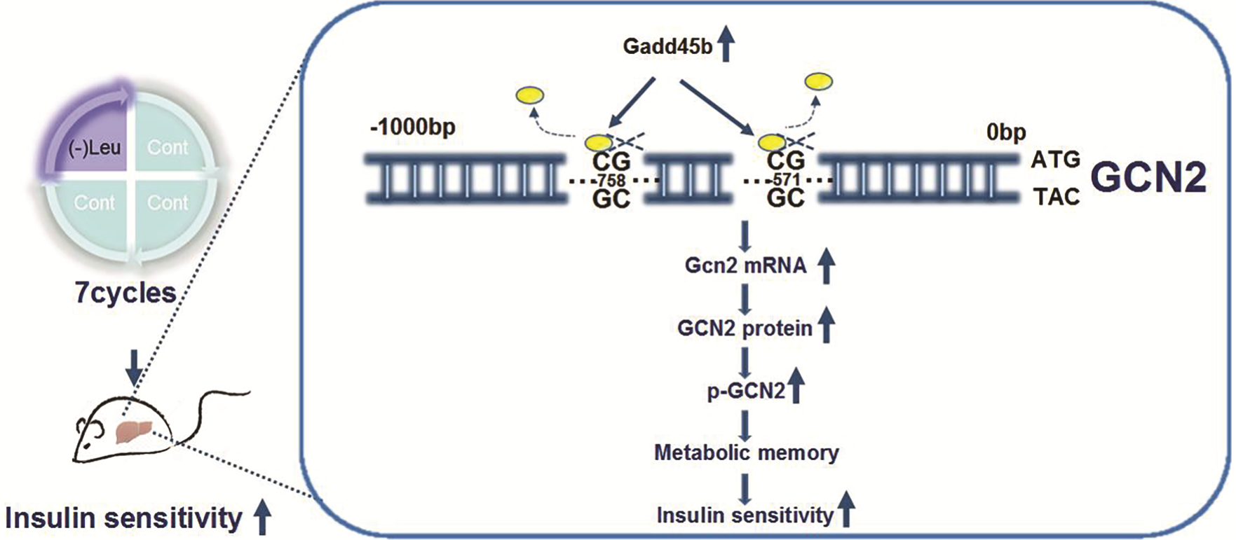 研究團(tuán)隊(duì)發(fā)現(xiàn)短期(1天)亮氨酸缺乏提高小鼠胰島素的效應(yīng)可持續(xù)3天。受間歇性禁食對代謝的有益作用啟發(fā),給予小鼠間歇性亮氨酸缺乏(1天缺乏飲食+3天對照飲食)處理,發(fā)現(xiàn)經(jīng)過7次間歇性亮氨酸缺乏處理后,即使恢復(fù)正常飲食,其對小鼠的胰島素敏感性提高作用可通過形成代謝記憶依然至少維持近3個(gè)月。更為重要的是,間歇性亮氨酸處理也持久地改善了不同模型中的胰島素抵抗現(xiàn)象。進(jìn)一步研究發(fā)現(xiàn),間歇性亮氨酸缺乏是通過增加肝臟GCN2表達(dá)發(fā)揮作用;而GCN2的表達(dá)是通過上調(diào)去甲基化酶Gadd45b來作用于其啟動(dòng)子的甲基化位點(diǎn)、進(jìn)而影響甲基化水平來實(shí)現(xiàn)的。