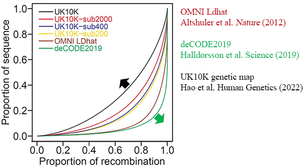 圖1、各個(gè)遺傳重組圖譜中遺傳重組異質(zhì)性的統(tǒng)計(jì)。如果遺傳重組在基因組中均勻分布,此時(shí)將不存在任何遺傳重組異質(zhì)性,并且對(duì)應(yīng)曲線為對(duì)角線。如果基因組中遺傳重組異質(zhì)性越高,則有更多的遺傳重組熱點(diǎn),對(duì)應(yīng)曲線越彎曲。