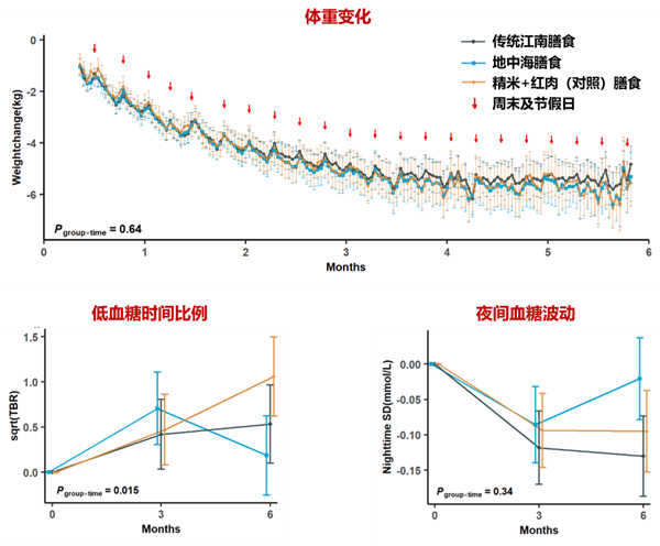在中科院資助下,林旭研究員團隊與瑞金醫(yī)院寧光院士/王計秋研究員等合作,在本項平行化的隨機對照干預中,共招募了 253名年齡25-60歲、超重或肥胖(BMI ≥ 24.0 kg/m2)且空腹血糖偏高(≥ 5.6 mmol/L)的志愿者。他們被隨機分配到3種等能量限制(25%能量限制)膳食組:地中海膳食組(84人),傳統(tǒng)江南膳食組(85人),或高精米和紅肉攝入的對照膳食組(84人)。在為期6個月的干預中,研究人員每周在5個工作日中向志愿者提供早中晚三餐,并通過連接手機應用的體重秤和智能手環(huán)來動態(tài)監(jiān)控體重和運動步數(shù)變化。志愿者分別在基線、干預3個月和6個月時受邀參加包括口服葡萄糖耐量試驗、連續(xù)血糖監(jiān)測、腹部脂肪檢測(核磁共振)在內(nèi)的體檢。通過系統(tǒng)的分析,林旭組博士生羅耀淦和副研究員孫亮等發(fā)現(xiàn):1)在6個月25%能量限制的干預后,地中海膳食組減重5.72 kg(95% CI:5.03,6.40),傳統(tǒng)江南膳食組減重5.05 kg(95% CI:4.38,5.73),對照膳食組減重5.38 kg(95% CI: 4.70,6.06),同時腹部脂肪減少在3組之間也無顯著統(tǒng)計學差異,提示了在有效的能量控制下,膳食模式優(yōu)化并不能進一步顯著提升減重效果;2)基于OGTT的空腹血糖、胰島素、Matsuda指數(shù)(胰島素敏感性指標)、血脂等心血管代謝指標在3組均顯著改善,且無顯著的組間差異;3)值得注意的是,CGM結(jié)果顯示(圖2):與對照膳食組相比,地中海膳食組顯著降低了干預6個月后低血糖(葡萄糖 < 3.9 mmol/L)時間比例[-0.81%(-1.40,-0.21),P = 0.024];傳統(tǒng)江南膳食也具有類似的優(yōu)勢[-0.56%(-1.15,0.03),P = 0.065]??傊?,盡管攝入了更高比例的碳水化合物(7%),傳統(tǒng)江南膳食在減重與血糖穩(wěn)態(tài)控制方面均表現(xiàn)出與地中海膳食類似的效果。雖然傳統(tǒng)江南膳食在我國長三角地區(qū)已具有悠久的歷史,但作為新提煉出的膳食模式概念,“傳統(tǒng)江南膳食”相關(guān)的研究剛剛起步,其食物組分及比例仍存在較大的提升空間,也期待更多的研究能夠進一步優(yōu)化我國本土膳食模式的最佳方案。