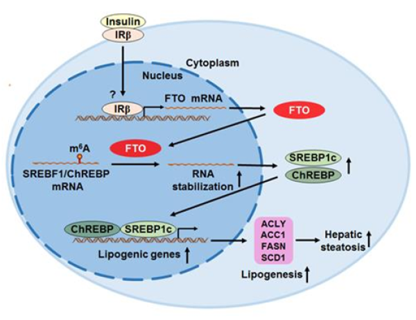 注:胰島素刺激肝細(xì)胞后,FTO的表達(dá)增加。FTO可以通過m6A去甲基化來穩(wěn)定SREBF1和ChREBP的mRNA,從而導(dǎo)致其蛋白質(zhì)水平增加,最終促進(jìn)了肝臟脂肪生成,導(dǎo)致肝臟脂肪變性。