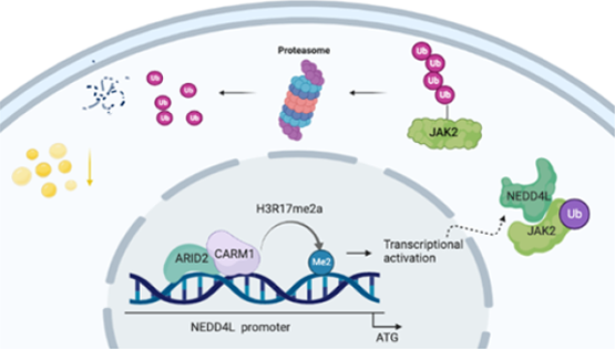 該研究發(fā)現(xiàn),Arid2肝臟特異性敲除的小鼠在正常飲食下7個月時會自發(fā)產(chǎn)生肝臟脂肪變性,高脂飲食則會加劇這一進程。研究人員進一步探索了其中的機理并揭示ARID2通過負調(diào)控JAK2-STAT5-PPARγ影響了肝臟脂質(zhì)代謝。機制研究發(fā)現(xiàn),ARID2通過上調(diào)E3連接酶NEDD4L的轉錄從而促進JAK2的泛素化。ARID2招募CARM1到NEDD4L的啟動子區(qū)域,增加該區(qū)域組蛋白H3第17位精氨酸的不對稱雙甲基化(H3R17me2a)從而促進其轉錄。此外,在Arid2肝臟特異性敲除的小鼠中,JAK2的抑制劑Fedratinib能夠有效的緩解高脂飲食誘導的肝臟脂肪變性。在商業(yè)購得的NAFLD病人的肝臟樣本中,研究人員檢測到了較低的ARID2蛋白水平并且驗證了ARID2與JAK2的負相關性。綜上所述,該研究揭示了ARID2在維護肝臟脂質(zhì)穩(wěn)態(tài)中的重要作用,并為ARID2缺失的NAFLD患者提供了有效的治療策略參考。