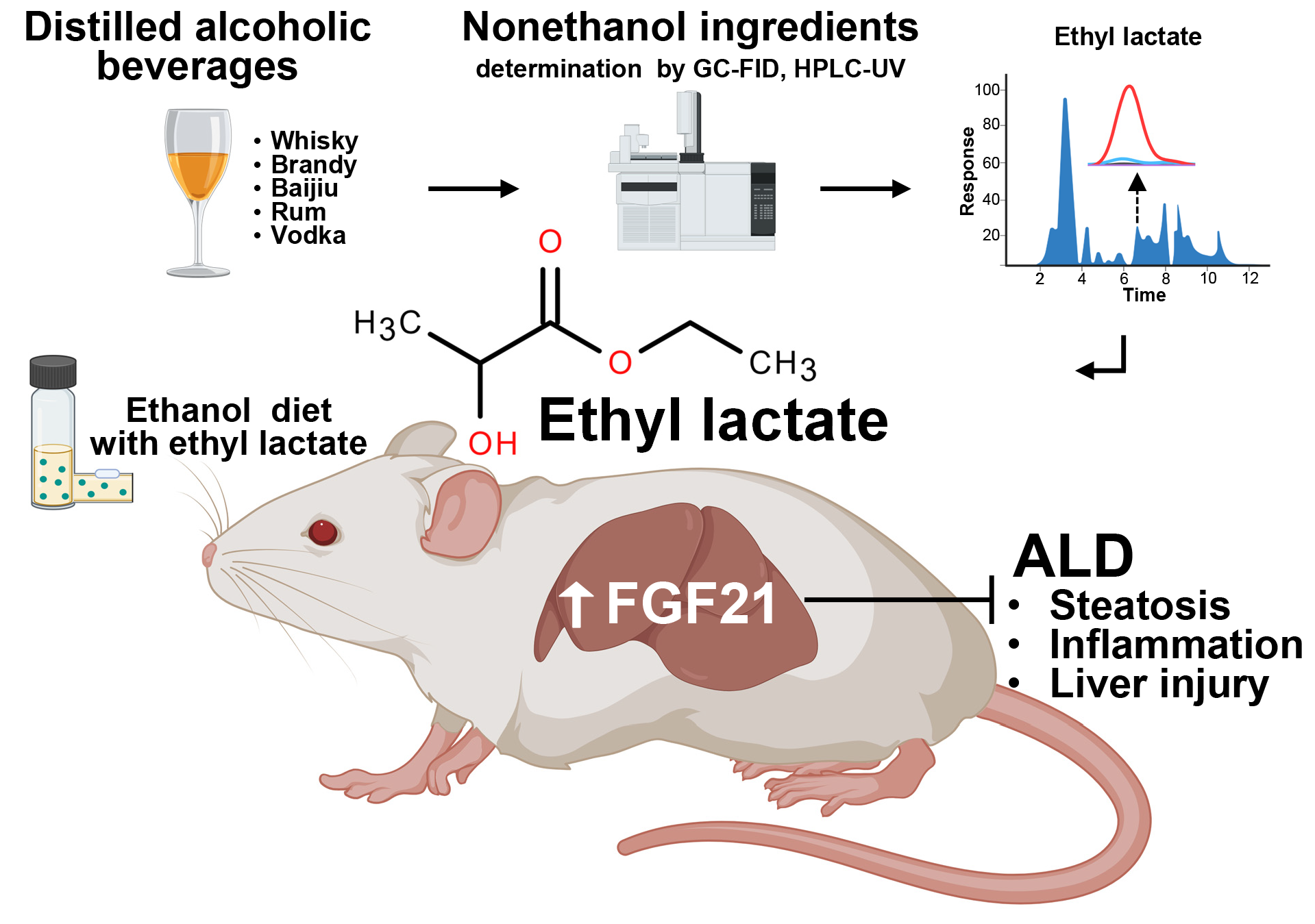 研究人員首先對(duì)世界五種典型蒸餾酒,包括威士忌、白蘭地、白酒、朗姆酒和伏特加,進(jìn)行氣相與液相色譜分析,在發(fā)現(xiàn)的40種非乙醇物質(zhì)中,將其中13種含量較高的化合物定義為蒸餾酒的代表性非乙醇物質(zhì)。隨后利用與人類酒精相關(guān)性肝病病理特征相似的慢性酒精喂養(yǎng)加急性酒精灌胃的小鼠模型(Gao-Binge Model),分別將13種蒸餾酒的代表性非乙醇物質(zhì)添加至含有酒精飼料中,探究其對(duì)酒精相關(guān)性肝病的影響。有意思的是,在這化合物中,乳酸乙酯展現(xiàn)出了顯著緩解酒精誘導(dǎo)的肝臟脂質(zhì)沉積、炎癥和慢加急性酒精性肝損傷的效果,并且乳酸乙酯對(duì)小鼠酒精相關(guān)性肝病的改善作用具有劑量依賴效應(yīng)。