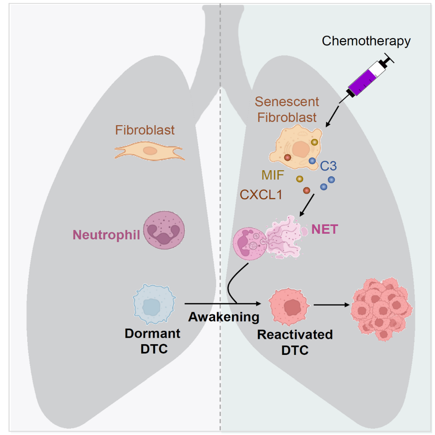 為此,研究人員利用休眠細(xì)胞標(biāo)志物p27蛋白建立休眠細(xì)胞譜系追蹤體系,證實(shí)初始治療后遠(yuǎn)端器官中長(zhǎng)期存在休眠腫瘤細(xì)胞,并在化療后蘇醒進(jìn)入增殖狀態(tài),形成轉(zhuǎn)移灶。研究團(tuán)隊(duì)進(jìn)一步通過單細(xì)胞測(cè)序、空間轉(zhuǎn)錄組測(cè)序技術(shù),對(duì)有無接受化療處理的小鼠肺組織進(jìn)行轉(zhuǎn)錄組分析。結(jié)果發(fā)現(xiàn),化療能夠誘導(dǎo)肺部成纖維細(xì)胞進(jìn)入衰老狀態(tài),并通過分泌衰老相關(guān)分泌因子刺激中性粒細(xì)胞形成胞外陷阱(NET)。而NET通過重塑細(xì)胞外基質(zhì),促進(jìn)休眠腫瘤細(xì)胞增殖,最終導(dǎo)致肺轉(zhuǎn)移。有臨床試驗(yàn)表明,達(dá)沙替尼和槲皮素可以靶向清除衰老細(xì)胞。研究人員證實(shí)化療與達(dá)沙替尼、槲皮素聯(lián)合使用,能夠清除化療誘導(dǎo)的衰老成纖維細(xì)胞,從而抑制化療后的肺轉(zhuǎn)移,為提高化療療效提供了新的治療方案。
