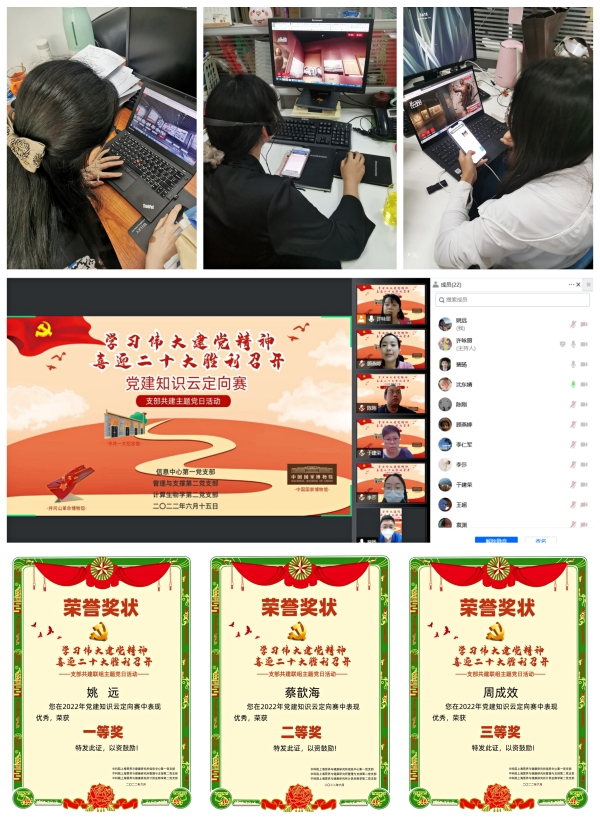 為深入落實基層黨支部黨史學習教育常態(tài)化長效化工作內(nèi)容,信息中心第一黨支部、管理與支撐第二黨支部、計算生物學第二黨支部于2022年6月15日下午聯(lián)合開展“學習偉大建黨精神,喜迎二十大勝利召開”黨建知識云定向賽。 本次比賽支部黨員通過云觀展的方式深入學習黨史,深入理解中國共產(chǎn)黨在各個歷史時期表現(xiàn)出的精神力量;同時通過在線定向賽的方式,鞏固黨史學習成果,在競賽中提升黨史理論水平。