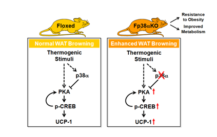 在這項最新的研究中,博士研究生張圣潔等人在應(yīng)浩研究員的指導(dǎo)下,發(fā)現(xiàn)脂肪組織特異敲除p38 后小鼠的體重減輕,但是體溫維持能力以及褐色脂肪產(chǎn)熱功能基本不受影響。而在低溫環(huán)境下,白色脂肪p38 缺失后能夠觀察到米色脂肪細(xì)胞比對照明顯增多,米色化活動加劇。在 腎上腺素受體激動劑CL316,243的刺激下,脂肪組織p38 缺失的小鼠能量消耗顯著增加。通過基因敲除小鼠和抑制劑定點注射兩種手段,發(fā)現(xiàn)p38 缺失或活性受損后能夠抵抗高脂飲食誘導(dǎo)的肥胖以及db/db小鼠體重的上升。通過一系列體外水平實驗,發(fā)現(xiàn)p38 缺失后在白色脂肪細(xì)胞中PKA以及CREB的活性同時上調(diào),促進(jìn)
