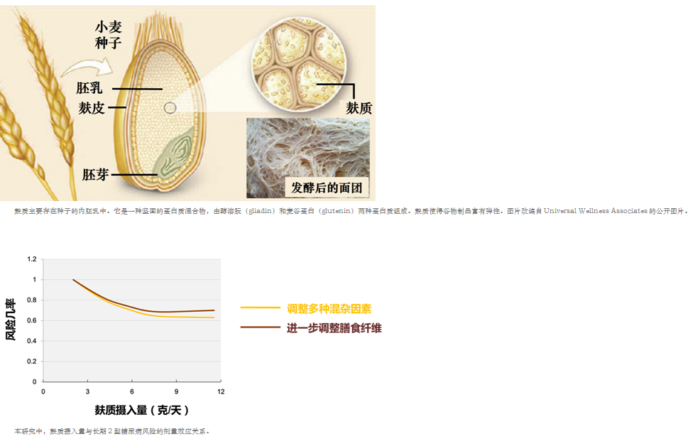 通過(guò)分析三次大規(guī)模的前瞻性隊(duì)列研究[TheNurses’Health Study(NHS)、NHS II、Health Professionals Follow-Up Study(HPFS)]中利用膳食調(diào)查問(wèn)卷獲得的隨訪(fǎng)數(shù)據(jù),我們發(fā)現(xiàn)在20-28年的隨訪(fǎng)中,調(diào)查人群(共計(jì)199794個(gè)男性和女性)的麩質(zhì)攝入相對(duì)穩(wěn)定,并與碳水化合物的攝入密切相關(guān)。麩質(zhì)攝入最高五分位的人比最低五分位的人患2型糖尿病的風(fēng)險(xiǎn)低13%。我們之前在同一人群中的研究也發(fā)現(xiàn),麩質(zhì)攝入量與冠心病發(fā)病風(fēng)險(xiǎn)無(wú)顯著關(guān)系(the British Medical Journal, 2016)。