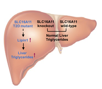2017年,來(lái)自麻省理工和Broad研究所的Eric Lander研究組針對(duì)這個(gè)基因組區(qū)域2型糖尿病易感突變的功能進(jìn)行了深入研究(Rusu,V.,et al. Cell.2017)。他們的研究發(fā)現(xiàn)部分SLC16A11定位于細(xì)胞質(zhì)膜,運(yùn)輸?shù)孜餅楸帷6巳褐邪l(fā)現(xiàn)的SLC16A11編碼區(qū)突變導(dǎo)致SLC16A11功能缺失,無(wú)法正常定位質(zhì)膜,影響丙酮酸運(yùn)輸,繼而導(dǎo)致肝臟脂滴積累增加,促使2型糖尿病的發(fā)生;研究同時(shí)提出通過(guò)提高SLC16A11表達(dá)水平或活性來(lái)治療2型糖尿病的潛在策略。但這項(xiàng)研究主要基于體外細(xì)胞過(guò)表達(dá)體系得到結(jié)論,缺乏體內(nèi)生理狀態(tài)下的直接證據(jù)。