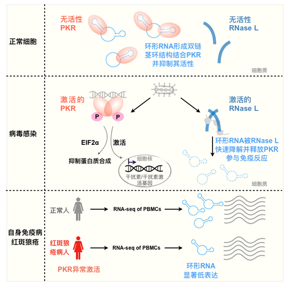 在這項最新的研究進展中,科研人員構(gòu)建了針對環(huán)形或線形RNA二級結(jié)構(gòu)的實驗和計算體系,通過對比發(fā)現(xiàn)環(huán)形RNA,而不是線形RNA,可以普遍形成16-26 bp的雙鏈RNA莖環(huán)結(jié)構(gòu);更為重要的是,環(huán)形RNA通過其特征的雙鏈RNA莖環(huán)結(jié)構(gòu)可以特異地與天然免疫因子PKR結(jié)合;在正常細(xì)胞狀態(tài)下,環(huán)形RNA通過結(jié)合PKR并抑制其活性,避免了PKR過度激活引起免疫反應(yīng);而當(dāng)細(xì)胞被病毒感染時,環(huán)形RNA可通過被RNase L快速降解進而釋放PKR參與細(xì)胞的抗病毒免疫過程。進一步通過對免疫性疾病-系統(tǒng)性紅斑狼瘡病人來源的外周血單核細(xì)胞分析表明,在紅斑狼瘡病人體內(nèi)環(huán)形RNA普遍低表達且PKR異常激活;而增加環(huán)形RNA的表達則可以顯著抑制病人來源外周血單核細(xì)胞和T細(xì)胞中的PKR及其下游免疫信號通路的過度激活。這一最新研究進展不僅首次回答了關(guān)于環(huán)形RNA降解、二級結(jié)構(gòu)特征和特殊生物學(xué)功能等一系列基礎(chǔ)科學(xué)問題,也為紅斑狼瘡等自身免疫病的臨床診斷和治療等應(yīng)用研究提供了新基礎(chǔ)。