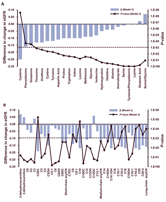 圖1 氨基酸譜(A)和?;鈮A譜(B)與6年前后腎功能(eGFR)改變的關(guān)聯(lián)關(guān)系