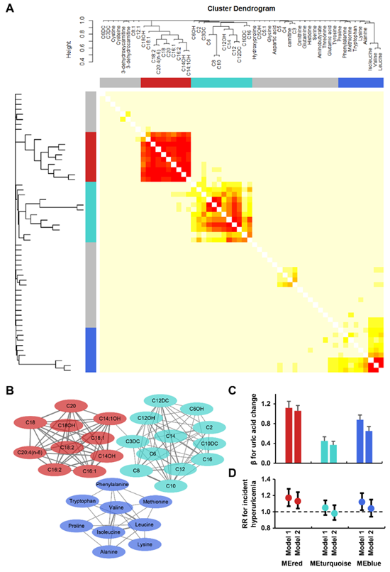 在林旭組已建立的前瞻性追蹤隊列樣本基礎(chǔ)上,曾嶸研究組采用氣相或液相色譜—串聯(lián)質(zhì)譜法檢測到22種氨基酸和34種游離肉堿/?;鈮A。林旭研究組博士生王飛杰通過分析6年隨訪的志愿者的代謝組學(xué)譜與腎功能下降和高尿酸血癥發(fā)病風(fēng)險,分別發(fā)現(xiàn):(1)在1765名基線腎功能正常的中老年人群中,基線血漿半胱氨酸、長鏈酰基肉堿(C14:1OH、C18、C18:2 和C20:4)和其它?;鈮A(C3DC和C10)的水平升高能顯著增加6年后新發(fā)腎功能下降風(fēng)險(腎小球濾過率<60 ml/min/1.73 m2),且該關(guān)聯(lián)關(guān)系獨(dú)立于基線腎功能(eGFR)等傳統(tǒng)風(fēng)險因素(圖1);(2)在1621名基線無高尿酸血癥的中老年人群中,基線血漿半胱氨酸、谷氨酰胺、苯丙氨酸、蘇氨酸和長鏈?;鈮A(C14:1OH、C18、C18:2、C20和C20:4)水平的升高能顯著增加6年后新發(fā)高尿酸血癥的風(fēng)險(尿酸:男性>420 mol/L,女性>360 mol/L),且關(guān)聯(lián)關(guān)系獨(dú)立于基線尿酸等傳統(tǒng)風(fēng)險因素;(3)使用主成分分析或網(wǎng)絡(luò)分析進(jìn)一步驗證了上述結(jié)果(圖2);(4)膳食模式分析發(fā)現(xiàn):多數(shù)與高尿酸血癥顯著相關(guān)的代謝物能被紅肉和加工肉類、豆制品等與尿酸升高相關(guān)的膳食因素解釋,提示了膳食-代謝物-疾病三之間者潛在的關(guān)聯(lián)機(jī)制。