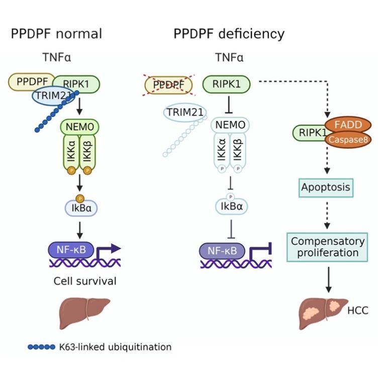 該研究發(fā)現(xiàn),PPDPF在肝癌中表達(dá)顯著下調(diào),PPDPF低表達(dá)的患者預(yù)后較差。在肝癌小鼠模型中敲除Ppdpf促進(jìn)HCC的發(fā)生發(fā)展。分子機(jī)制研究表明PPDPF缺失抑制NF- B信號通路的激活,使肝細(xì)胞發(fā)生細(xì)胞凋亡,進(jìn)而引發(fā)補(bǔ)償性的細(xì)胞增殖。進(jìn)一步研究揭示PPDPF可以與RIPK1發(fā)生相互作用,通過招募TRIM21促進(jìn)RIPK1 140位賴氨酸K63連接的泛素化,從而激活NF- B信號通路。在臨床樣本中,研究人員發(fā)現(xiàn)PPDPF的表達(dá)和NF- B激活標(biāo)志p-P65的表達(dá)呈正相關(guān)。綜上所述,該研究揭示了PPDPF調(diào)控NF- B信號通路的新機(jī)制,同時提示PPDPF可能是一種治療肝癌的潛在候選分子。