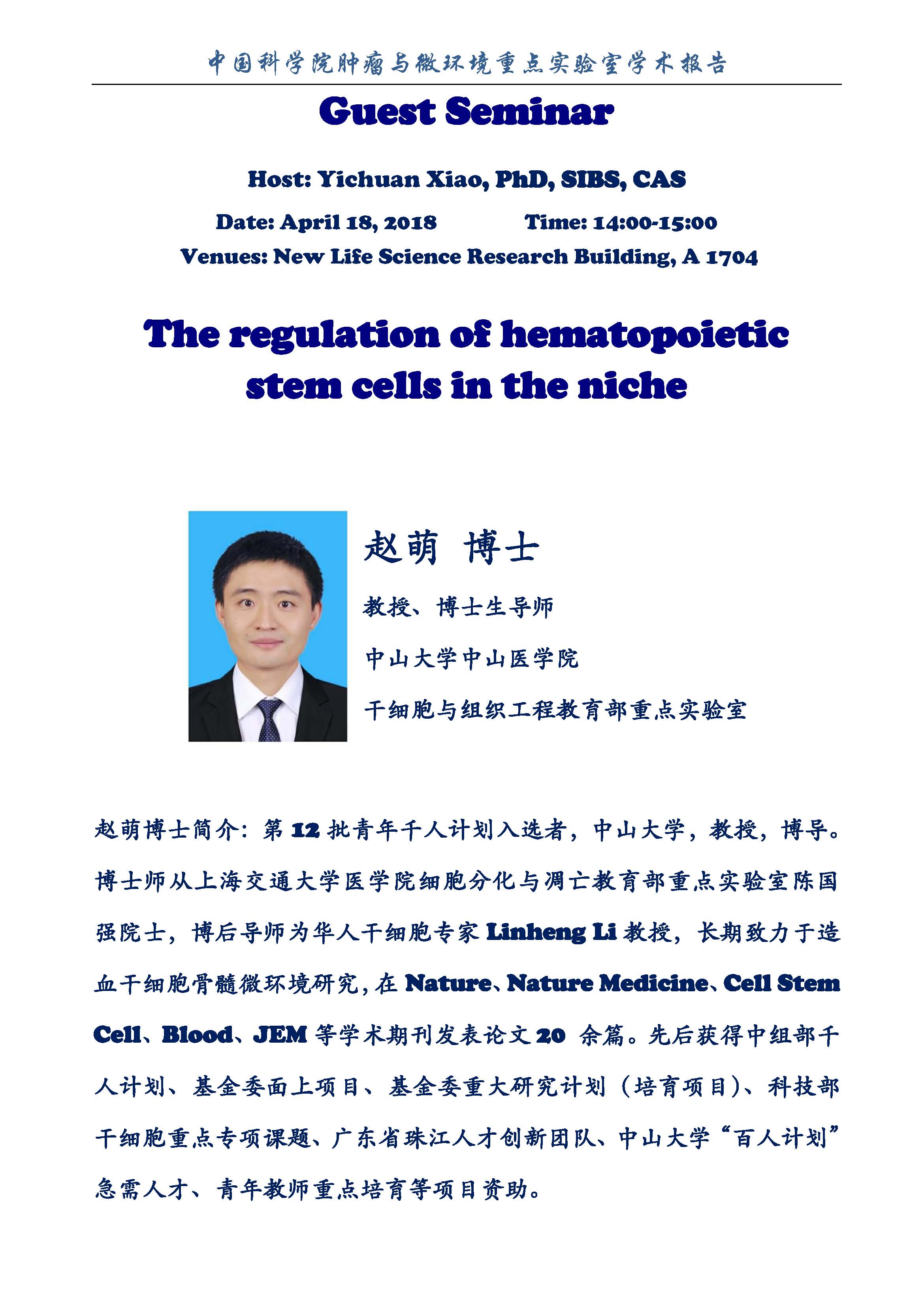 中科院腫瘤與微環(huán)境重點實驗室學術報告:The regulation of hematopoietic stem cells in the niche