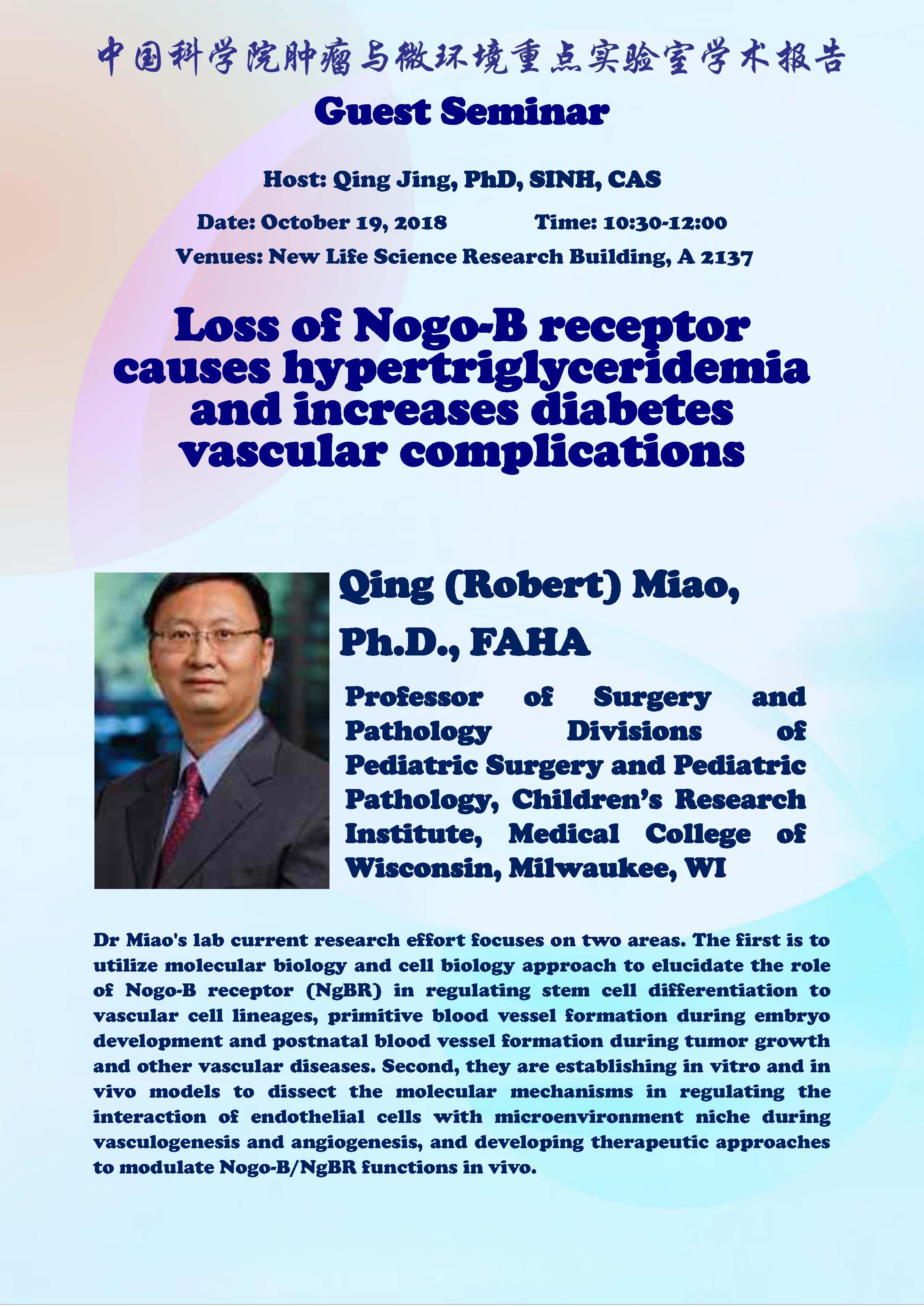 中科院腫瘤與微環(huán)境重點實驗室學(xué)術(shù)報告:Loss of Nogo-B receptor causes hypertriglyceridemia and increases diabetes vascular complications