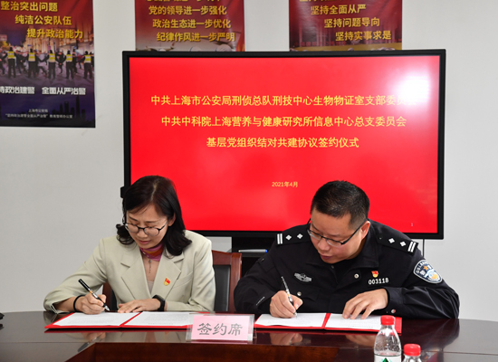 4月20日上午,營養(yǎng)與健康所信息中心黨總支各支部十余位黨員赴上海市公安局刑偵總隊(duì)刑事技術(shù)研究管理中心(以下簡稱刑技中心)開展主題黨建活動(dòng)。活動(dòng)中,信息中心黨總支與刑技中心生物物證室黨支部舉行了支部共建簽約儀式。