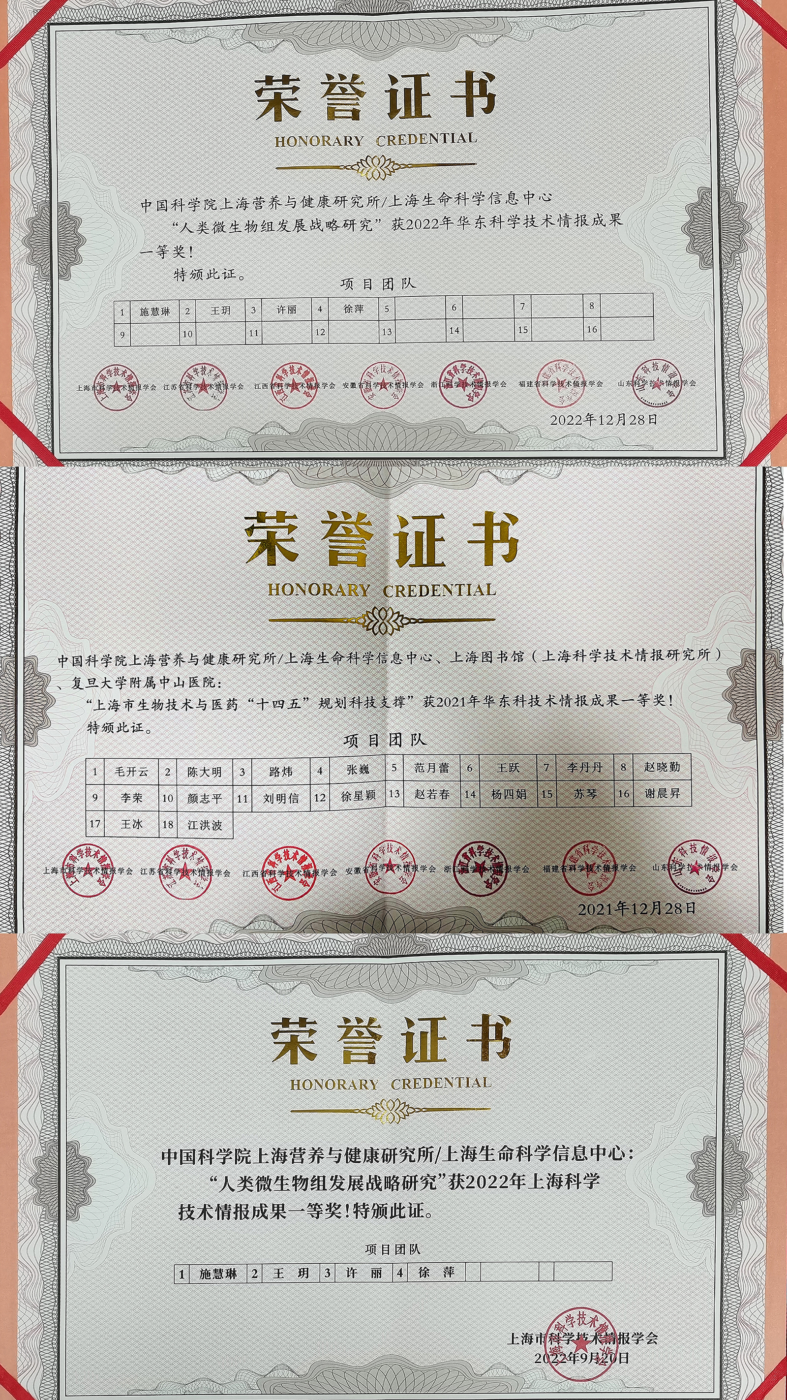 中國(guó)科學(xué)院上海營(yíng)養(yǎng)與健康研究所/中國(guó)科學(xué)院上海生命科學(xué)信息中心(生命健康科技智庫(kù))作為中科院部署的五大情報(bào)研究與服務(wù)體系之一,面向研究所、中國(guó)科學(xué)院、國(guó)家相關(guān)部委以及企業(yè)與園區(qū)等,提供科技戰(zhàn)略決策支撐、開(kāi)展學(xué)科發(fā)展戰(zhàn)略研究,支撐區(qū)域科技創(chuàng)新發(fā)展等。在過(guò)去的兩年中,情報(bào)團(tuán)隊(duì)?wèi){借長(zhǎng)期以來(lái)在科技戰(zhàn)略、產(chǎn)業(yè)與技術(shù)情報(bào)中的杰出表現(xiàn),先后榮獲2022年華東地區(qū)科學(xué)技術(shù)情報(bào)成果獎(jiǎng)一等獎(jiǎng)1項(xiàng),二等獎(jiǎng)2項(xiàng);2022年上海地區(qū)科學(xué)技術(shù)情報(bào)成果獎(jiǎng)一等獎(jiǎng)1項(xiàng),二等獎(jiǎng)5項(xiàng),三等獎(jiǎng)1項(xiàng);2021年華東地區(qū)科學(xué)技術(shù)情報(bào)成果獎(jiǎng)一等獎(jiǎng)1項(xiàng),三等獎(jiǎng)2項(xiàng);2021年上海地區(qū)科學(xué)技術(shù)情報(bào)成果獎(jiǎng)二等獎(jiǎng)4項(xiàng),三等獎(jiǎng)2項(xiàng)。
