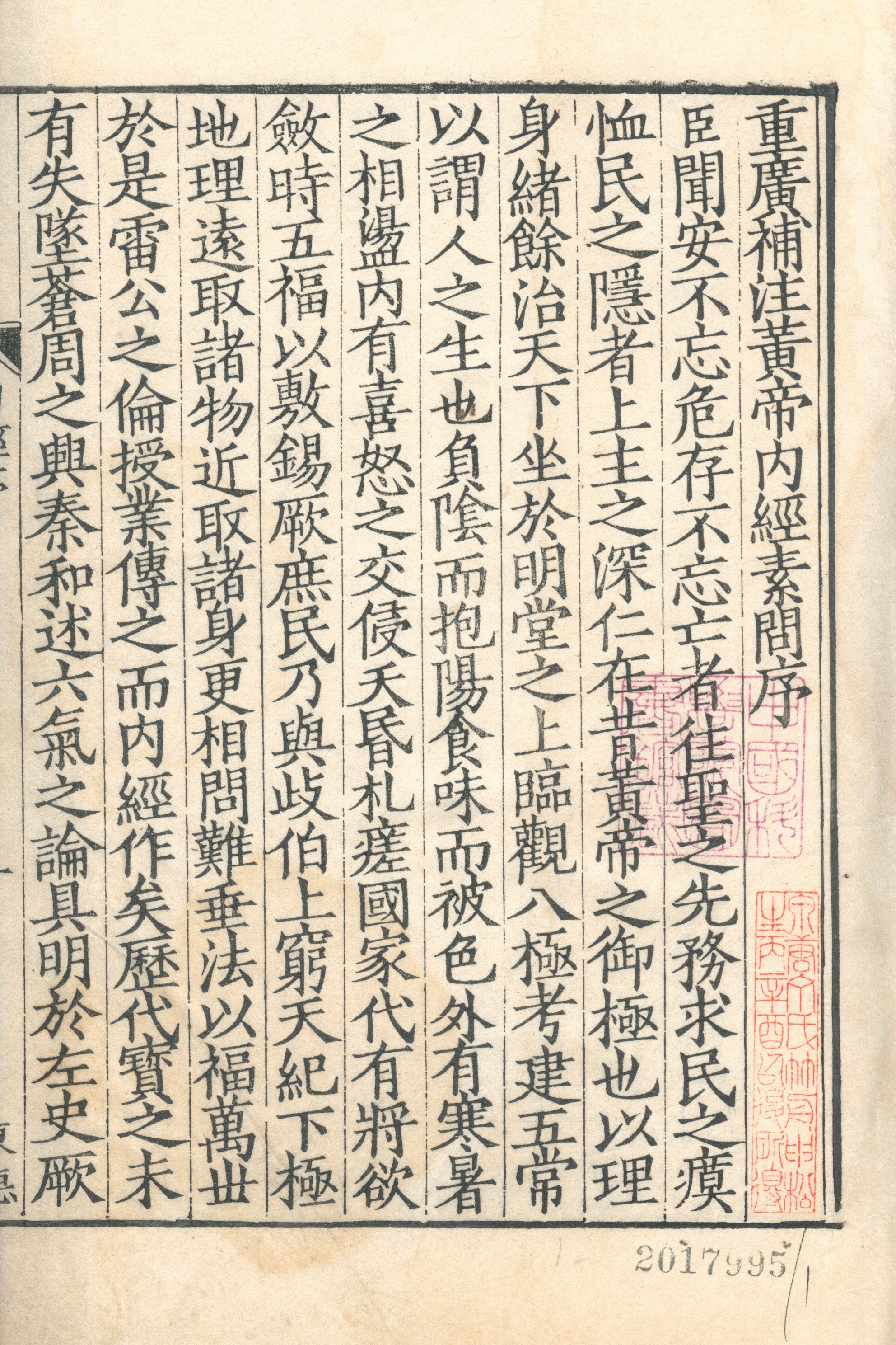 3.重廣補(bǔ)注黃帝內(nèi)經(jīng)素問二十四卷,唐王冰注,宋林億等校正,宋孫兆改誤,明嘉靖二十九年(1550)顧從德影宋刻本;