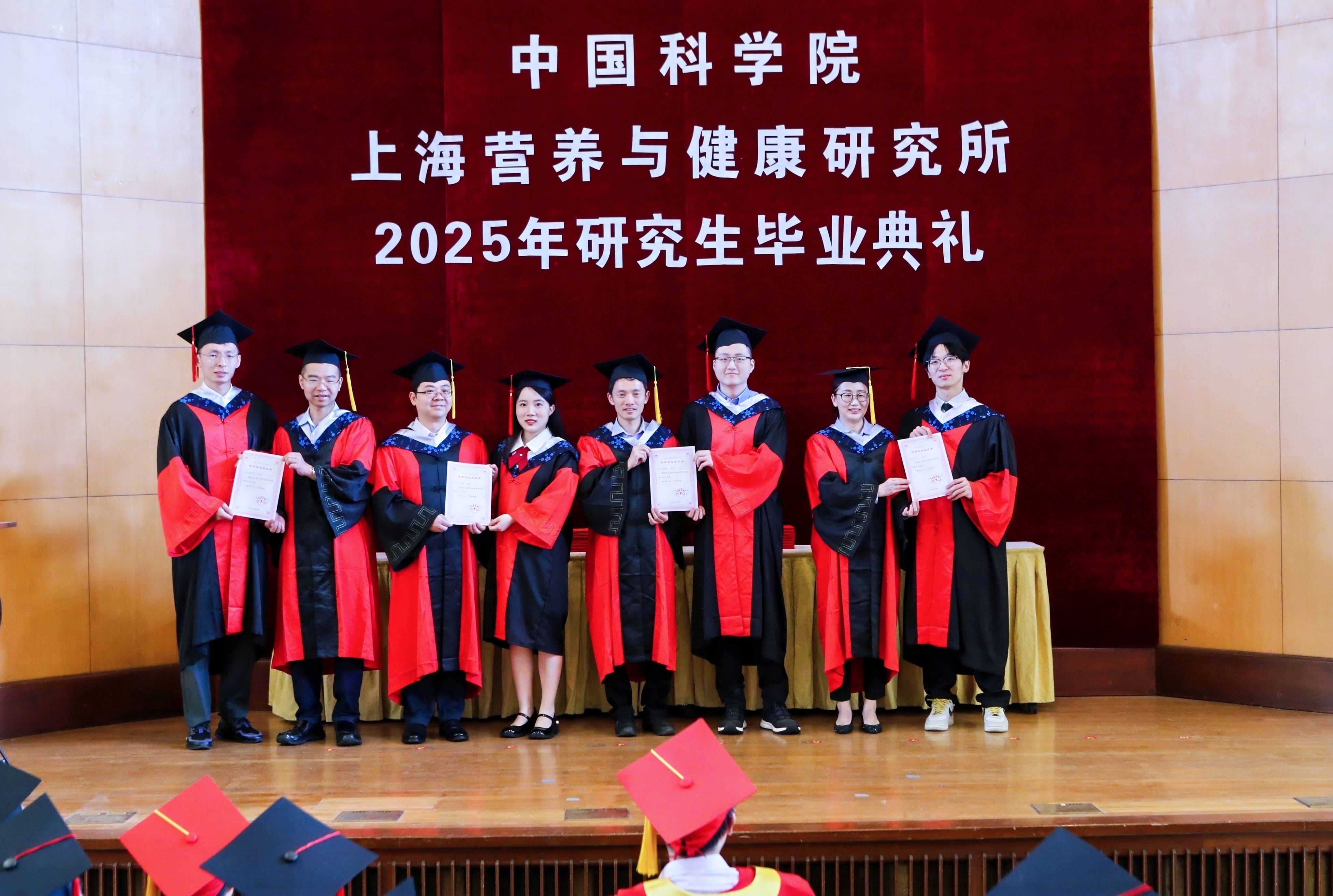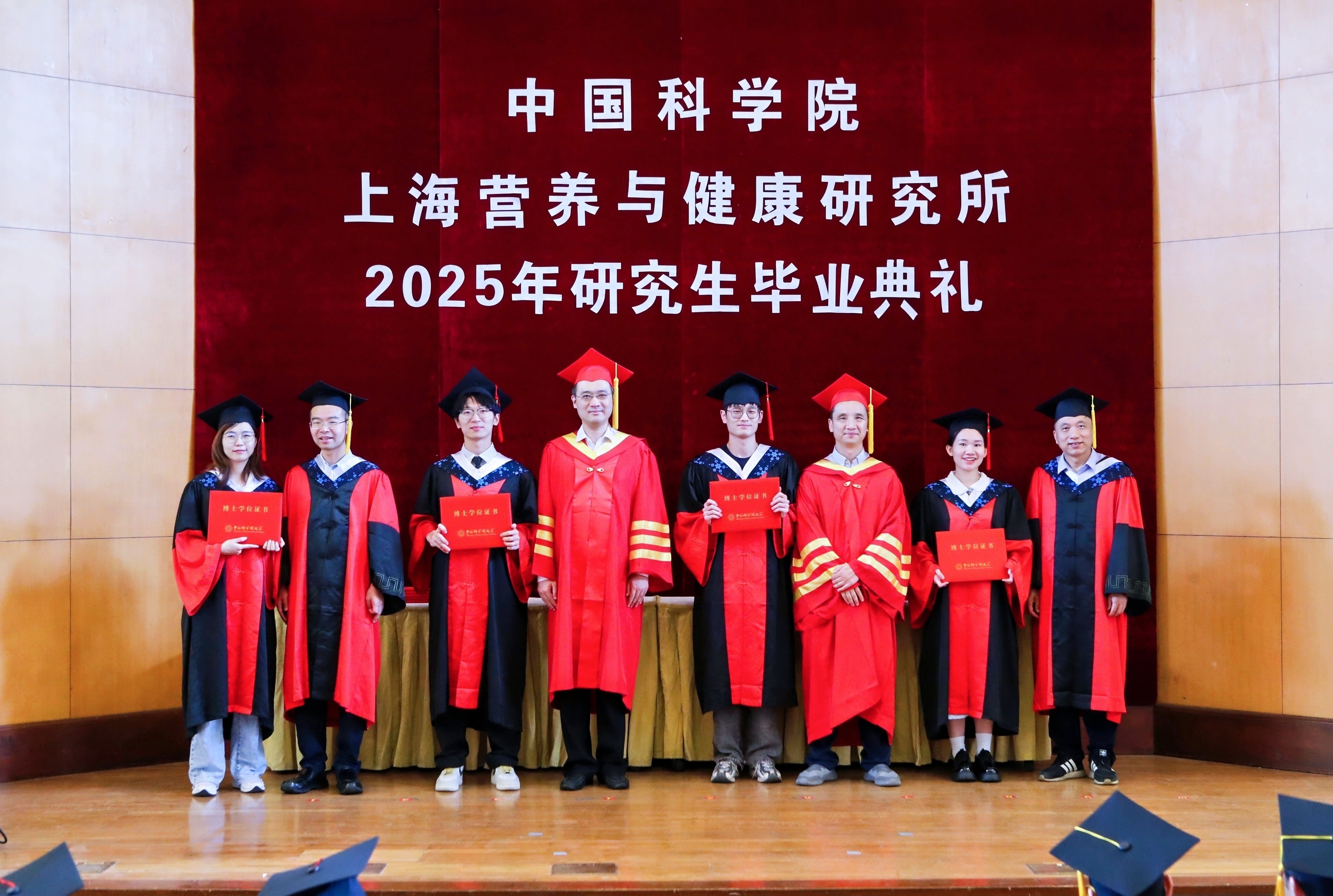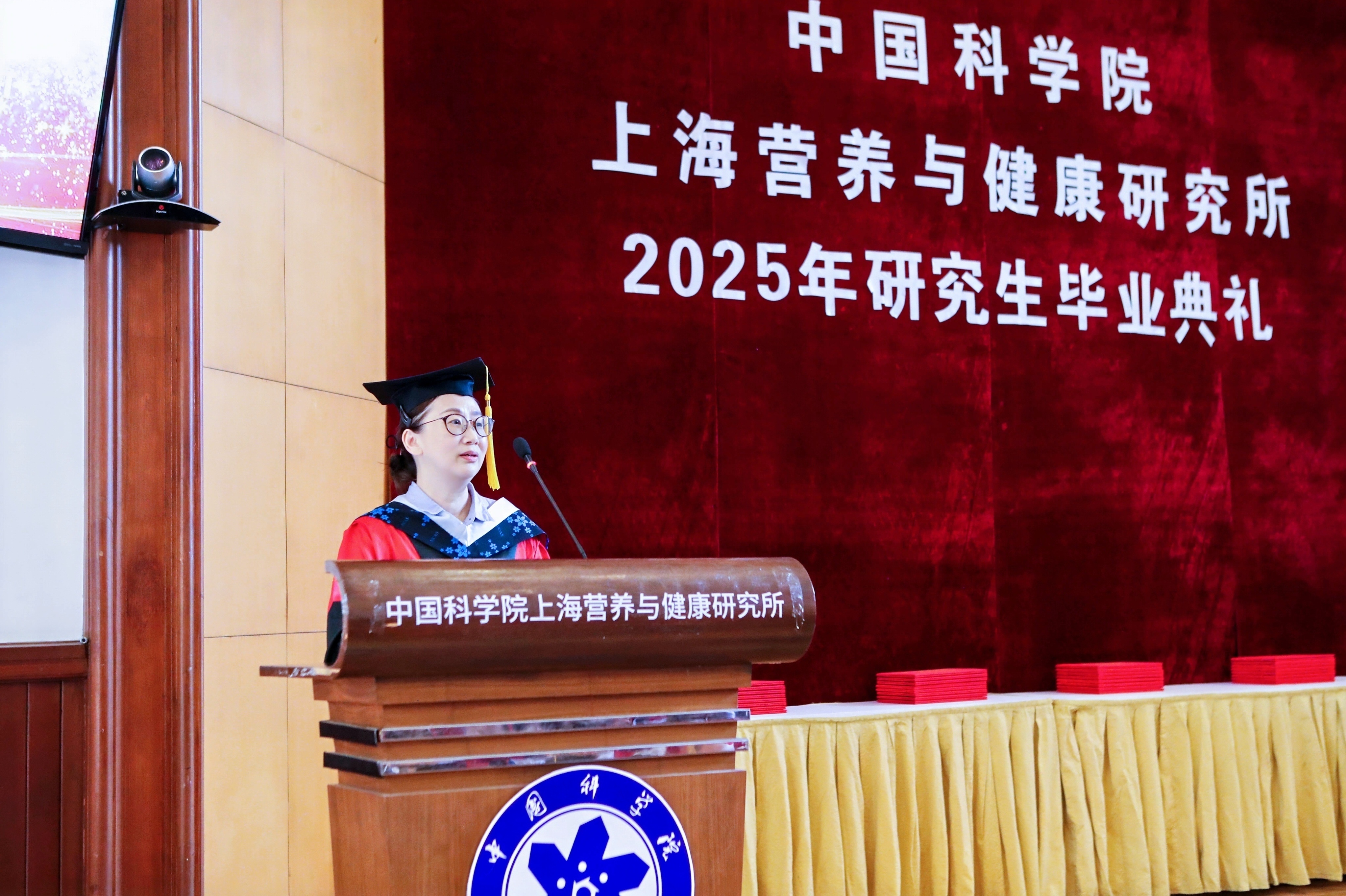 6月20日,中國科學(xué)院上海營養(yǎng)與健康研究所2025年研究生畢業(yè)典禮在生科大樓報告廳舉行。營養(yǎng)與健康所所長、黨委副書記汪思佳,副所長、學(xué)位評定委員會主席胡國宏,所務(wù)委員、學(xué)位評定委員會副主席邵振,學(xué)位評定委員會委員孔祥銀、王躍祥,導(dǎo)師代表熊燕、黃濤、王振,2025屆畢業(yè)生與畢業(yè)生親友、研究生處教育管理干部等100余人齊聚一堂,共同參與了這一盛典。畢業(yè)典禮由邵振主持。