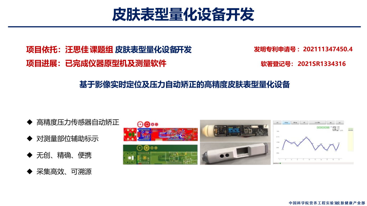 皮膚健康部隸屬于中國科學院上海營養(yǎng)與健康研究所工程實驗室,坐落于上海市徐匯區(qū)漕寶路500號園區(qū),現(xiàn)有實驗室500㎡。皮膚健康部致力于打造面向皮膚健康產(chǎn)業(yè)的數(shù)據(jù)驅(qū)動型工程孵化平臺,關(guān)注皮膚健康領(lǐng)域,為研究所提供相關(guān)技術(shù)與知識產(chǎn)權(quán)的轉(zhuǎn)化。其中皮膚特性量化平臺已具備承載工程項目的能力,數(shù)據(jù)庫搭建及健康模型建立等平臺處于籌建階段。