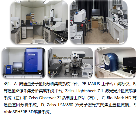 “Uli Schwarz量化生物學(xué)質(zhì)量控制平臺(tái)” 占地250平米左右,為計(jì)算生物學(xué)所提供基本的實(shí)驗(yàn)技術(shù)支持、實(shí)驗(yàn)場(chǎng)地和技術(shù)培訓(xùn)等。該平臺(tái)由DNA實(shí)驗(yàn)室、 RNA實(shí)驗(yàn)室、有毒試劑實(shí)驗(yàn)室、實(shí)驗(yàn)解剖室、樣品存儲(chǔ)區(qū)、公共細(xì)胞房、高通量分子量化分析集成系統(tǒng)子平臺(tái)(圖1A)以及高通量圖像采集分析集成系統(tǒng)子平臺(tái)(圖1B)組成。該平臺(tái)不僅配備了基礎(chǔ)的細(xì)胞分子生物學(xué)常用儀器,而且還配備了先進(jìn)的諸如激光光片顯微成像系統(tǒng)、雙光子激光共聚焦正置顯微鏡等大型儀器。不僅面向中國(guó)科學(xué)院上海營(yíng)養(yǎng)與健康所及其他兄弟單位開放,還面向上海市及國(guó)內(nèi)其它科研單位以及企業(yè)開放。