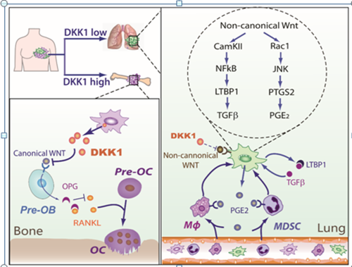 博士研究生壯雪倩在胡國(guó)宏研究員的指導(dǎo)下,發(fā)現(xiàn)腫瘤分泌的WNT信號(hào)抑制蛋白DKK1調(diào)控了癌細(xì)胞轉(zhuǎn)移時(shí)對(duì)靶器官的選擇性。DKK1高分泌的腫瘤傾向轉(zhuǎn)移到骨,而低分泌的腫瘤傾向轉(zhuǎn)移到肺。他們通過(guò)與山東大學(xué)團(tuán)隊(duì)合作發(fā)現(xiàn)乳腺癌病人血清中DKK1蛋白水平可預(yù)測(cè)乳腺癌骨轉(zhuǎn)移和肺轉(zhuǎn)移的風(fēng)險(xiǎn)。進(jìn)一步的功能研究表明,DKK1在肺和骨轉(zhuǎn)移微環(huán)境中通過(guò)靶向不同細(xì)胞的不同信號(hào)通路從而發(fā)揮相反的轉(zhuǎn)移調(diào)控作用。在肺中DKK1抑制非經(jīng)典WNT通路,減少巨噬細(xì)胞和中性粒細(xì)胞的招募并同時(shí)抑制癌細(xì)胞分泌生長(zhǎng)因子TGF 的水平,從而抑制肺轉(zhuǎn)移。而在骨中DKK1通過(guò)抑制成骨細(xì)胞的經(jīng)典WNT信號(hào),從而促進(jìn)骨轉(zhuǎn)移形成。對(duì)腫瘤施用經(jīng)典WNT信號(hào)通路抑制劑后,肺轉(zhuǎn)移并未顯著下降而骨轉(zhuǎn)移情況惡化。相反的,聯(lián)合使用JNKTGF R抑制劑能夠同時(shí)抑制肺轉(zhuǎn)移和骨轉(zhuǎn)移。